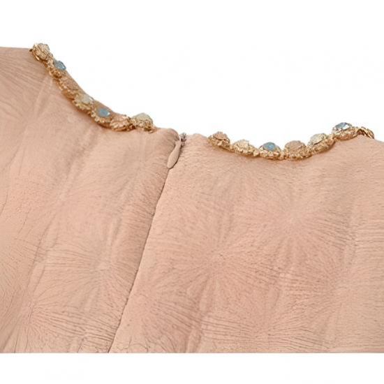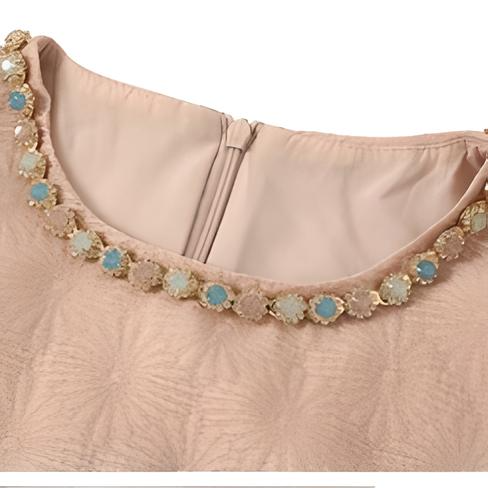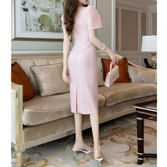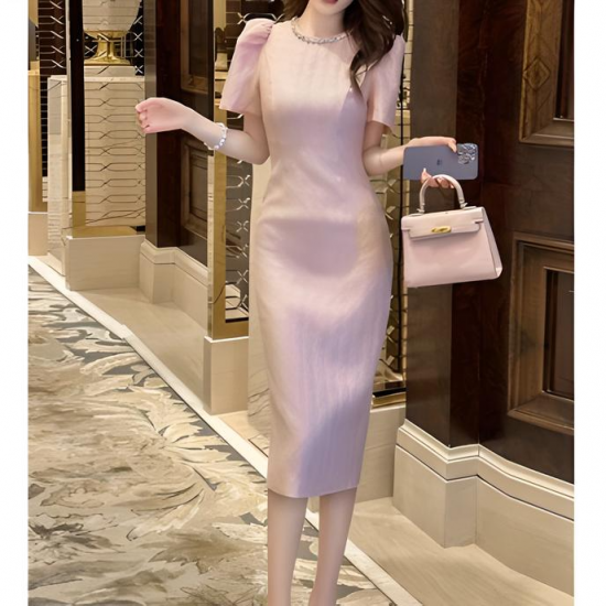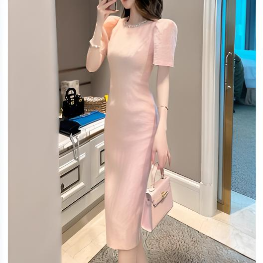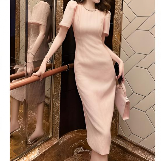 淡いピンクが女性らしさを引き立てるタイトシルエットのワンピース。シンプルながらも、上品な生地のテクスチャーと袖のパフデザインがポイントとなり、フェミニンな魅力を演出します。膝下丈のエレガントなシルエットは、様々なシーンで活躍する万能アイテムです。